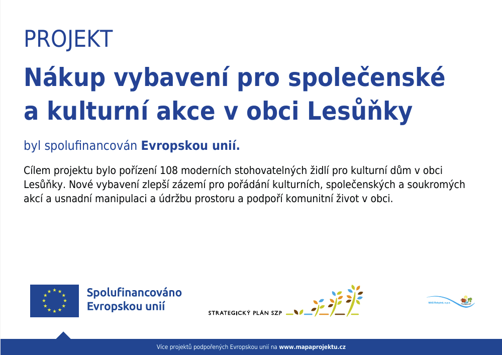 Cílem projektu bylo pořízení 108 moderních stohovatelných židlí pro kulturní dům v obci Lesůňky. Nové vybavení zlepší zázemí pro pořádání kulturních, společenských a soukromých akcí a usnadní manipulaci a údržbu prostoru a podpoří komunitní život v obci.